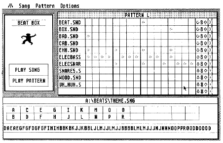 Below the pattern letter grid is a line of text representing your song. Letters can be added, inserted or removed as easily as a word processor. When you click on "Play Song," Beat Box plays your patterns in the order listed. This is a limited but very straightforward approach.