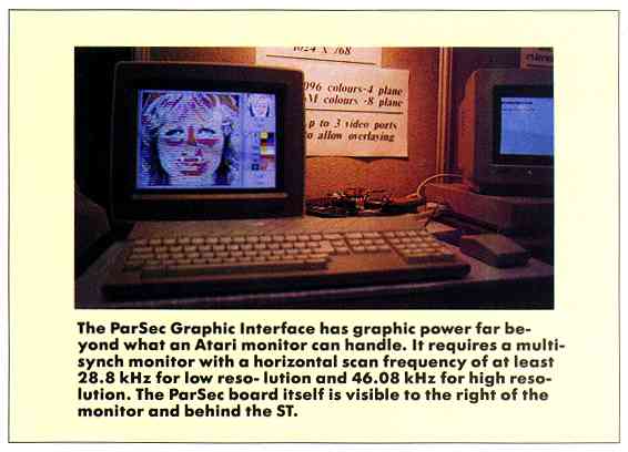 Enter the ParSec from Elmtech. To see it, I went to England's Alexandria Palace Convention Hall. There, among all the trappings of an Atari ST show, I found Elmtech Research Ltd.'s Director David Encill amidst a mob of ST devotees squeezed into his small booth. Everyone was watching STs displaying graphics that just couldn't be-without the ParSec Graphic Interface.