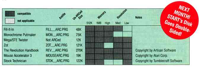 2) Make a backup copy. We format the disk using TWISTER.PRG (included on this disk) to increase the size of a single-sided disk to 400K. You can back up onto one Twisted, single-sided disk; one double-sided disk; or two GEM-formatted, single-sided disks. NOTE: TWISTER DOES NOT WORK WITH GEM'S DISKCOPY. To make a backup using GEM's filecopy, open a window for your START disk, then drag the files in the window to the icon representing your backup disk (users of single disk-drive systems will be instructed by GEM to swap disks.) 3) Store the original and use the backup hereafter. 4) Un-ARC the files. We use Double Click Software's DC SEA utility to create self-extracting archive files. To un-ARC a program, simply double-click on the filename. 5) When the dialog box appears, choose Extract. 6) When the file selector appears, choose a destination disk (hard disk, RAM disk or floppy disk) for the uncompressed files. Make sure the destination disk has enough space for the uncompressed files, whose sizes are given in the chart above. The screen goes blank, then the files are listed as they are extracted, and marked "OK" if the uncompression is successful. |