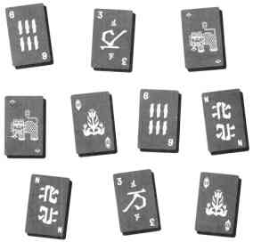When the game begins, tiles are laid out on the board in four levels, indicated by color. The bottom (level 1) tiles are gold, level 2 tiles are blue, level 3 tiles are red, and the top tiles (level 4) are white. The tiles are numbered from I to 9 in different suits, with each of the 27 individual tiles repeated four times. In addition, there are four different "wild" suits, used to alter the difficulty factor of the game.