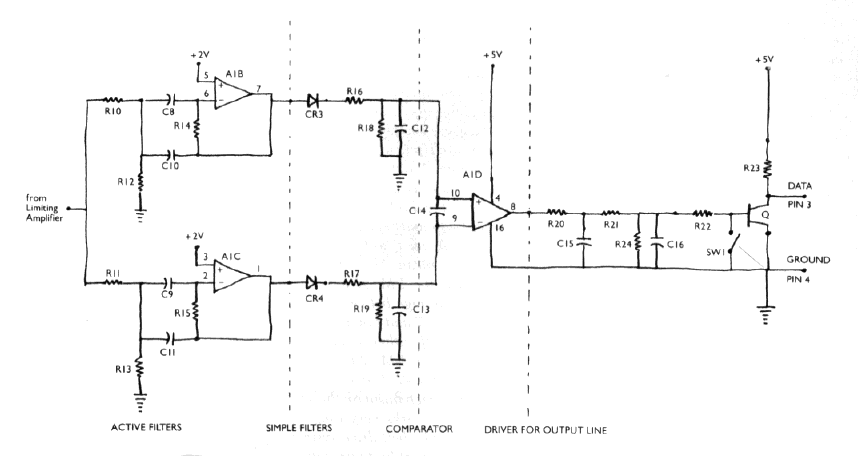 The resistors to replace are the ones in the feedback loops of the two active filters. Specifically, I am referring to the 240K-ohm, l/2-watt resistor and the 330K-ohm, 1/4-watt resistor. Replacing these two resistors will 'tighten' the window of frequencies that will be interpreted as data. In addition, I recommend that you replace the ten-per-cent tolerance 56K, 5.6K, 68K, and 7.5K, 1/4 watt resistors which you will also find in that part of the circuit. I must caution you that any tampering of this type will void the warranty on the recorder, so you should wait until the warranty expires before making these modifications.