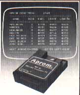 APROM is a very sophisticated program development tool. A cartridge for the right slot of the Atari 800, it functions nominally as an EPROM programmer for 2764 (8K) and 27128 (16K) EPROMS. Extra functions include program controlled block switching and, with the APROM operating system, you can store various machine language programs the APROM and execute them with a two-key command.