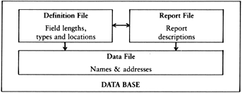 ![]() A DATA BASE consists of related files. A definition file describes the record in terms of field lengths and types. A report file describes report characteristics such as which field to print, where and when to subtotal which fields. A data file contains user data such as names or amounts. Files with pointers to data records for random access are often required but are invisible to the user. |
