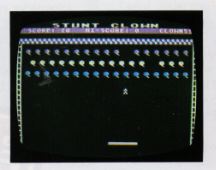 Stunt Clown is a one-player game using a Joystick in Port One. To start the game and launch a clown, press the trigger. The trampoline is moved left and right with the Joystick. Each new game starts with three Stunt Clowns. An extra Stunt Clown is awarded every 500 points. Allowing a clown to hit the ground disqualifies that clown from the competition. When all but seven of the balloons are popped, a new lot is released and your trampoline is shortened. The game ends when you have no clowns left.