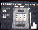 Each press of the fire button inserts one dime in to the slot machine. The first dime plays the center row; the second plays the top row; and the third plays the bottom row. For each dime you play, the progressive jackpot (which is displayed at the top of the screen) increases by four cents. Any minor jackpots are indicated at the left of the screen. Also displayed on the left, in whole dollar amounts, are running totals of the money played and won.