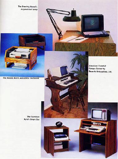 If Benjamin Franklin had owned an Atari computer, he might have housed it in a piece of Americana such as this. This version of Compu-Center would fit in perfectly with an American Colonial decor. Hand-rubbed and oiled to emphasize its authentic-looking detail, the unit features a traditional "Trestle" design in 1 1/4" thick pine, and can help organize all of your hardware, software and accessories. Complete instructions for assembly are included. A matching Colonial printer stand (not shown) is available for $89.95. And, for those of you with more up-to-date tastes, Bauerle Enterprises also carries more contemporary versions of Compu-Center.