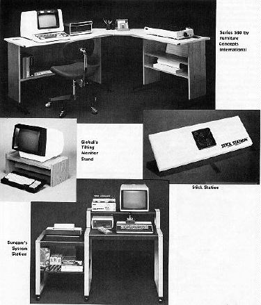 The 1984 Winter Consumer Electronics Show introduced many an innovative item into the home-computer market. Among these was Suncom's System Station, a versatile, modular storage unit that rides on casters. Lightweight and airy in design, it is nonetheless quite capable of holding all of the elements a computer owner dreams of. The basic unit consists of a desk of comfortable, typing-table height. Add-ons include a detachable monitor stand, a printer stand and a book/diskette storage area. The desk alone is $79.00.
