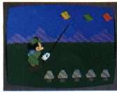 The goal of the first game in "Mickey Goes Exploring" is to complete a mathematical equation. You must help Mickey catch the butterfly that carries the correct number of mathematical operation. The six, seven, and eight year olds I tested did better with addition and subtraction than with multiplication. With practice, however, they can learn their multiplication and division; the computer provides the correct answer after two mistakes have been made. It also gives you an easier problem to try following an error. By the way, the game's graphics are enchanting.