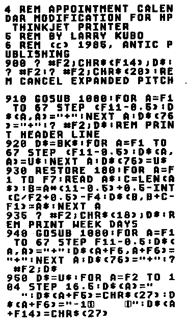 Larry Kubo of Santa Rosa, CA sent the following modification that will enable Appointment Calendar to print out on a Hewlett Packard ThinkJet printer. It produces three pitches: expanded, normal and compressed.