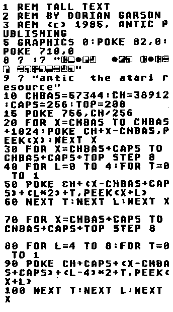 This program helps you make letters two times the normal size by modifying the Atari special characters set. The [CONTROL] characters form the top portion of the larger letters, and the lowercase letter character set becomes the bottom portion of each letter.