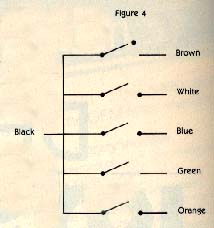 The part we are interested in is the circuit board--the square fiberboard with the wires attached. (See Figure 3). Notice that the copper lines running across the board eventually end up at the six wires. Five silver buttons accent where the lines meet. Each of these huttons is a switch. When depressed, they complete (close) a circuit.