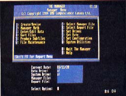 The Manager sorts files, links databases, or redesigns databases already containing information. It can also fix a damaged database and reconstruct indexes. It has a full set of utility programs for copying, deleting, listing and renaming the files and folders on your disks.
