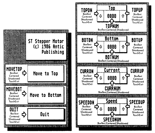 Antic Disk owners can LinkLine the program over to their STs right away. LOAD both STEPPER.PRG and STEPPER.RSC to your ST. For the program to fully work, you need to build the interface board described in the 8-bit stepper motor story. However, if you just want to study the programming of ST dialog boxes, this program will run only if you have your printer connected and online.
