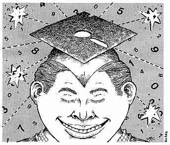 Next you'll choose a delay factor before the computer displays the answer. You may choose delays between 1 (shortest delay) to 10 (longest). Now you can pick either flash cards or a test. If you choose flash cards, the computer places arithmetic problems on the screen and you try to guess the answer before the computer shows it to you.