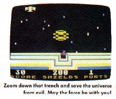 To hit the green oval vents, line up your cursor aiming system. Use a joystick in port 1 and press the trigger button to fire. If you think this sounds easy, think again. The Doomstar has plenty of its own Imperial fighters, which attack one by one---and can`t be knocked out unless they are dead-center in your screen.