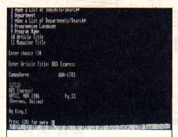Type a 4 at the "Enter choice!" prompt, for complete bibliographic information about the article-- including author, which issue it appeared in, the page number and whether there are any type-in listings. If the complete text of the article has already been uploaded, it will appear when you press [RETURN]. Otherwise, that [RETURN] will take you back to the SEARCH BY menu.