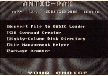 Antic-Pak contains the following five complete program routines. Each one will run independently when you select it from the main menu. All you have to do is follow the onscreen prompts. To get started, Type in Listing 1, ANTICPAK.BAS, check it with TYPO II and SAVE a copy before you RUN it.