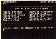 Under the file access menu, you can [P]rotect or [U]nprotect, [E]rase, [R]ename, [V]iew(type text files to the screen), [A]ppend to, and [C]opy files. The really new features are the [W]orking, [N]ew, and [D]elete directory options, used to manage your sub-directories.