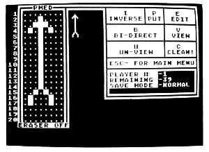 Press [A] on the main menu to access the Animator program. When the screen clears, you'll be asked to put the Player/Missile Graphics Studio disk in drive 1 and press [RETURN]. Player/Missile Graphics Studio will create a temporary file, TEMP.ANM, which holds the players you have in memory at the moment. So don't put a write-protect tab on the Player/Missile Graphics Studio disk, and make sure the disk has at least 30 free sectors.