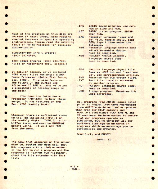 To print the HELP file from an Antic disk, put the disk in Drive 1. With the printer ready, choose option [1], ANTIC HELP FILE. The program will read the HELP file and print it in two columns.