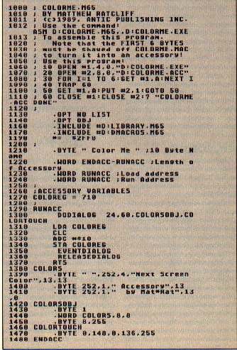 The file SKELETON.M65 was included in Diamond to assist you in writing your own desktop accessory. The skeleton file was incorrect, and I took a bit of deciphering of RESET.ACC to get it right. I spent several hours studying the source files and came up with COLORME.ACC. This accessory, when activated, will shift the desktop color to the next hue value (same intensity) and display a dialog box. Click the button, and the desk top will return to normal operation in the new color.