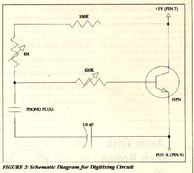 The small AC current sent to the digit circuit from your audio source causes the base current to change through the transistor. This in turn varies the effective resistance presented to the paddle port. The computer believes that a paddle controller is connected and is being turned back and forth at a very high rate. The 1M pot is used as the circuit's gain control to get rid of most unwanted noise during program execution. The 100K pot is used to control input volume into the circuit.