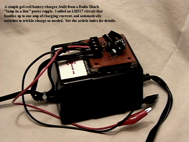 I added an LM317 circuit to the top of a Radio Shack "lump-in-a-line" 12 VDC power supply.  This made a gel-cell battery charger that is thermally limited to about one amp, and automatically switches to trickle-charge when necessary.  NOTE:  You CANNOT use this charger for NiCd or NiMH batteries.  Total cost to build is under $20; if you have a well-stocked junk box, you can do it for zip.  Here is a picture (177K).  See May 1994 in the article index.