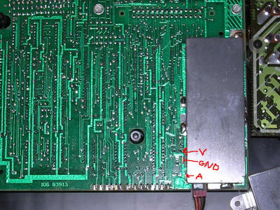 Composite video, with quite brighter colors, can be found in mainboard as well as audio signal. The exact location of pins with A (Audio), V (video) and GND (ground) is shown in the picture:
