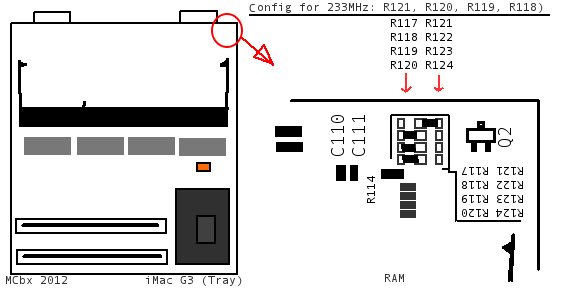 1. You should think about connecting iMac's fan directly to 12V DC (power supply connector) - as it may overheat after overclocking. On the other side connecting fan to 12V DC makes it much louder than before. To be honest, you can bump the 233's CPU to 300MHz, but it'll overheat, because on 233Mhz it works on the edge of its heat limits.