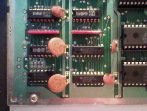 The photo shows lower left edge of the mainboard. U5 and U6 are two not MOS manufactured chips in the second column. U8 - above U5 (and RP4), U7 - to the left of U5 covered by decoupling capacitor.