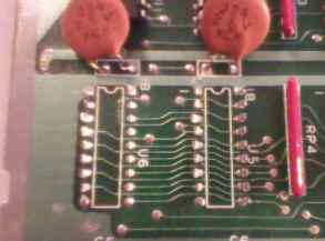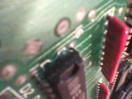 U7 is more complicated. 5V line goes on the component side from its pin 16, which must stay powered. So we flip the board back to the component side and look in pins 1 and 16 of U7. Unfortunately it's covered by the chip and this is the best photo I could do. The thing is to stick a knife just below pin 16 and try to cut this track coming down from pin 16. After some cutting check with ohmmeter is there a conductivity btween pin 16 and 2. If not - very good!,
