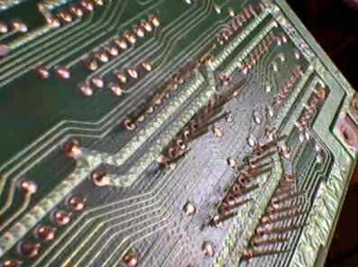 As you turn the board, you'll see "craters" of solder on the other side. We need to remove them by simply cutting them off with a knife. Remember to rotate the board, so that pieces of solder won't short other pins.