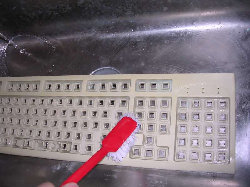 water, add some washing powder (only for moulded keycaps, for printed ones