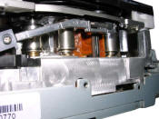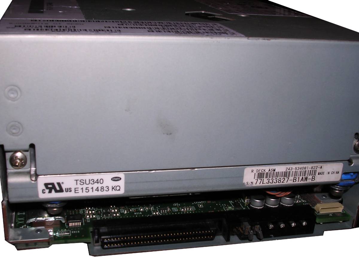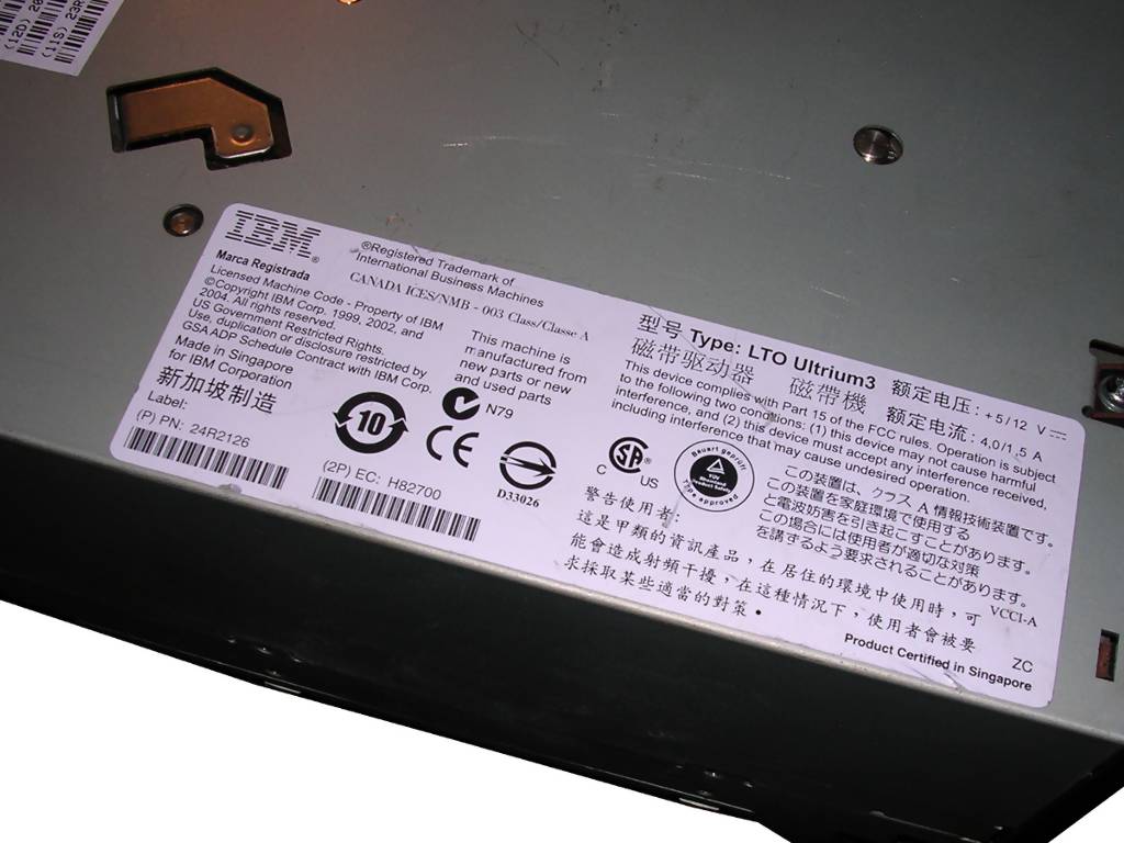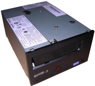 This is an LTO Ultrium 3 (400GB uncompressed) streamer made by IBM for use in their servers. Its state can be observed using small 7-segment LED display. It uses a fast, Ultra160 SCSI eoth 68-pin connector. As compliant with standards, this streamer can also read and write to Ultrium2 (200GB) cartridges and read Ultrium 1 (100GB) cartridges.