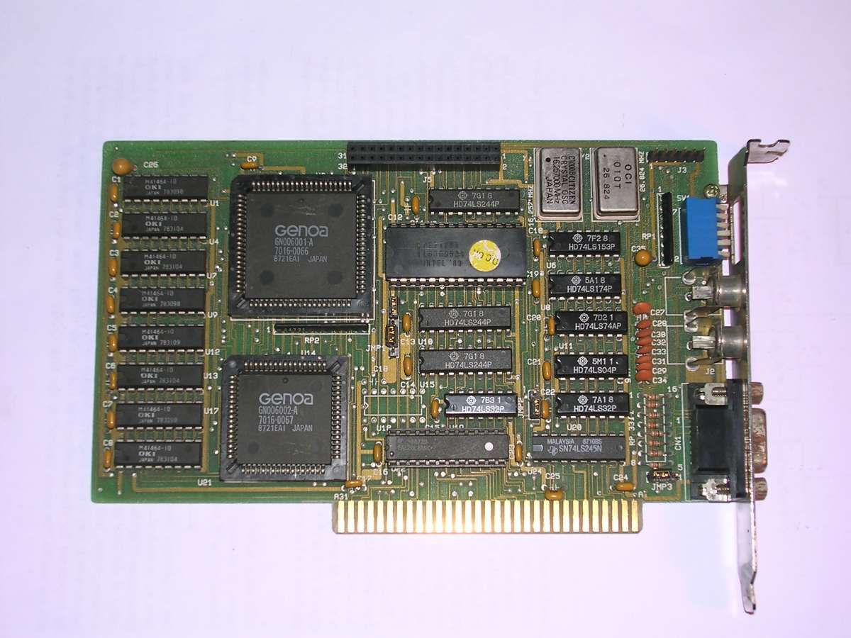 Genoa EGA clone with 256kB of RAM. In 1990s there were lots of EGA and VGA clones with more-or-less similar compatibility. This one is EGA, with two (?) composite outputs as well as light pen connector.