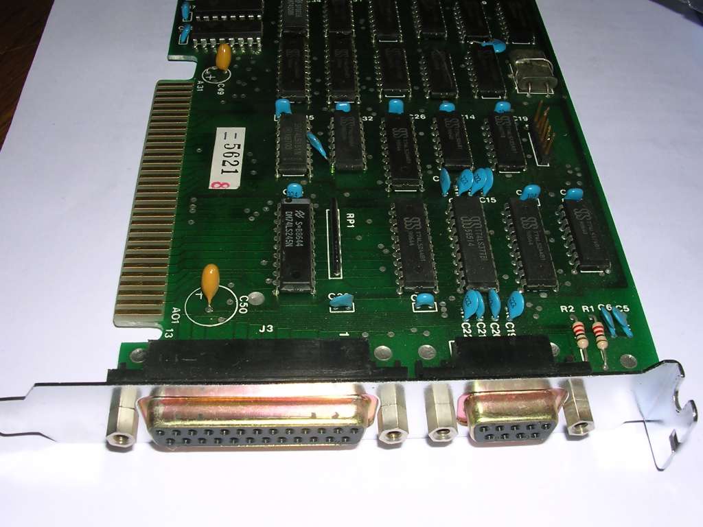 For Taiwanese PC clones, MDA was rarely used. Here we have a Hercules board with built-in ROM, made around discrete chips with only small share of VLSI circuits. As usual, it has parallel port for printer, being a Video and printer adapter. The board is quite large and fills a whole standard of full-height full-length board.