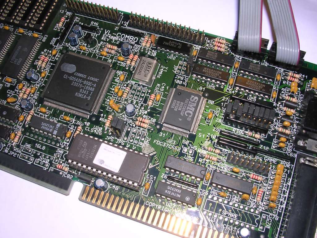 Most of ISA chipsets were improved and used in VLB (VESA Local bus) boards too. VLB slots lived shortly in 486 computers, mostly because of forcing synchronization with CPU clock. Also, technical difficulties arose when adding one more slot to 16-bit ISA. Here we can see two boards, one is a typical video-only board, the second is a "combo" board - it has a video board, serial and parallel port controller as well as IDE and FDD controllers in a single board.