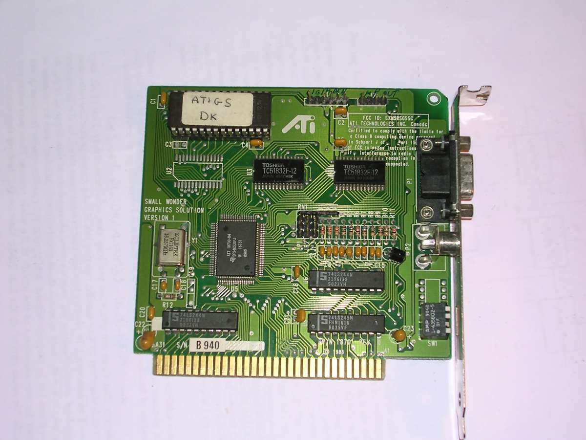 ATI Small Wonder Graphics Solution was one of the first ATI video boards, made in early 1990s. It was compatible with CGA, and in CGA modes it was possible to display on a TV using composite output. 64kB of RAM has been soldered in mainboard.