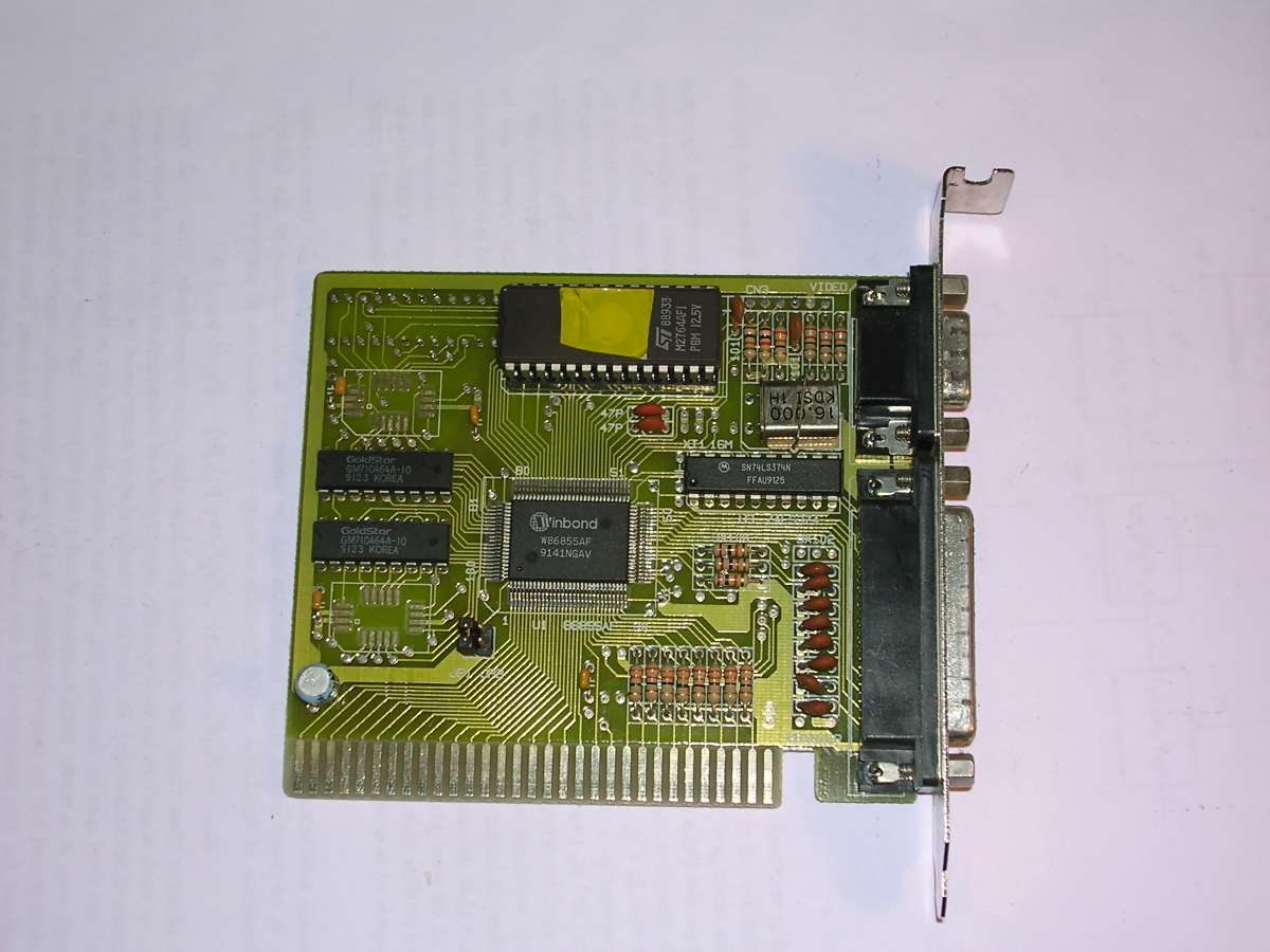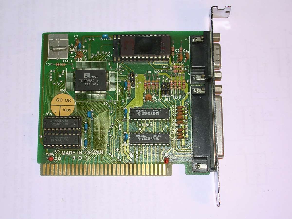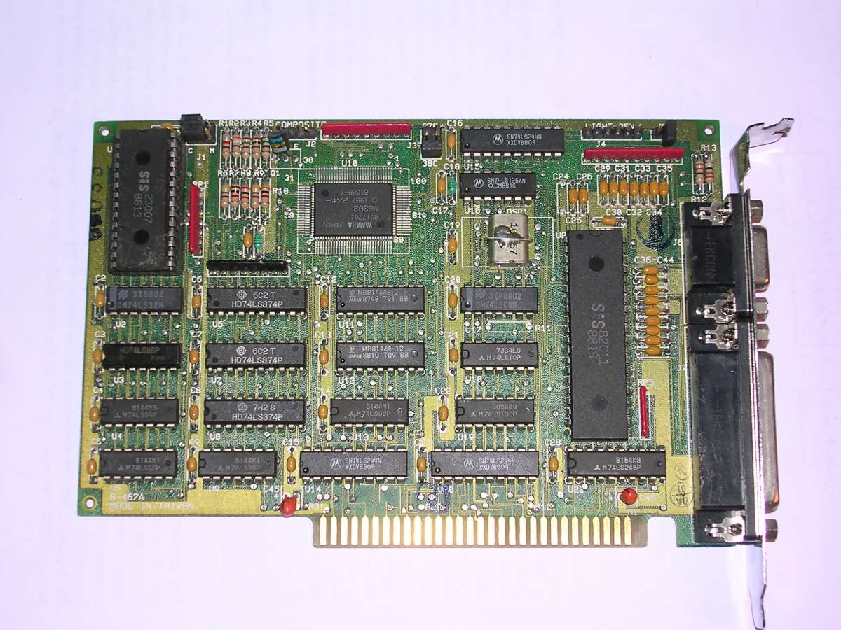 Yamaha V6363 was an MDA/CGA/HGC chip which was frequently used in late 80s. This board has also a printer adapter and light pen connector, as with CGA, which was rarely used. There is also a jumper to select colour or monochrome (MDA/HGC) modes because some displays shown CGA modes badly.
