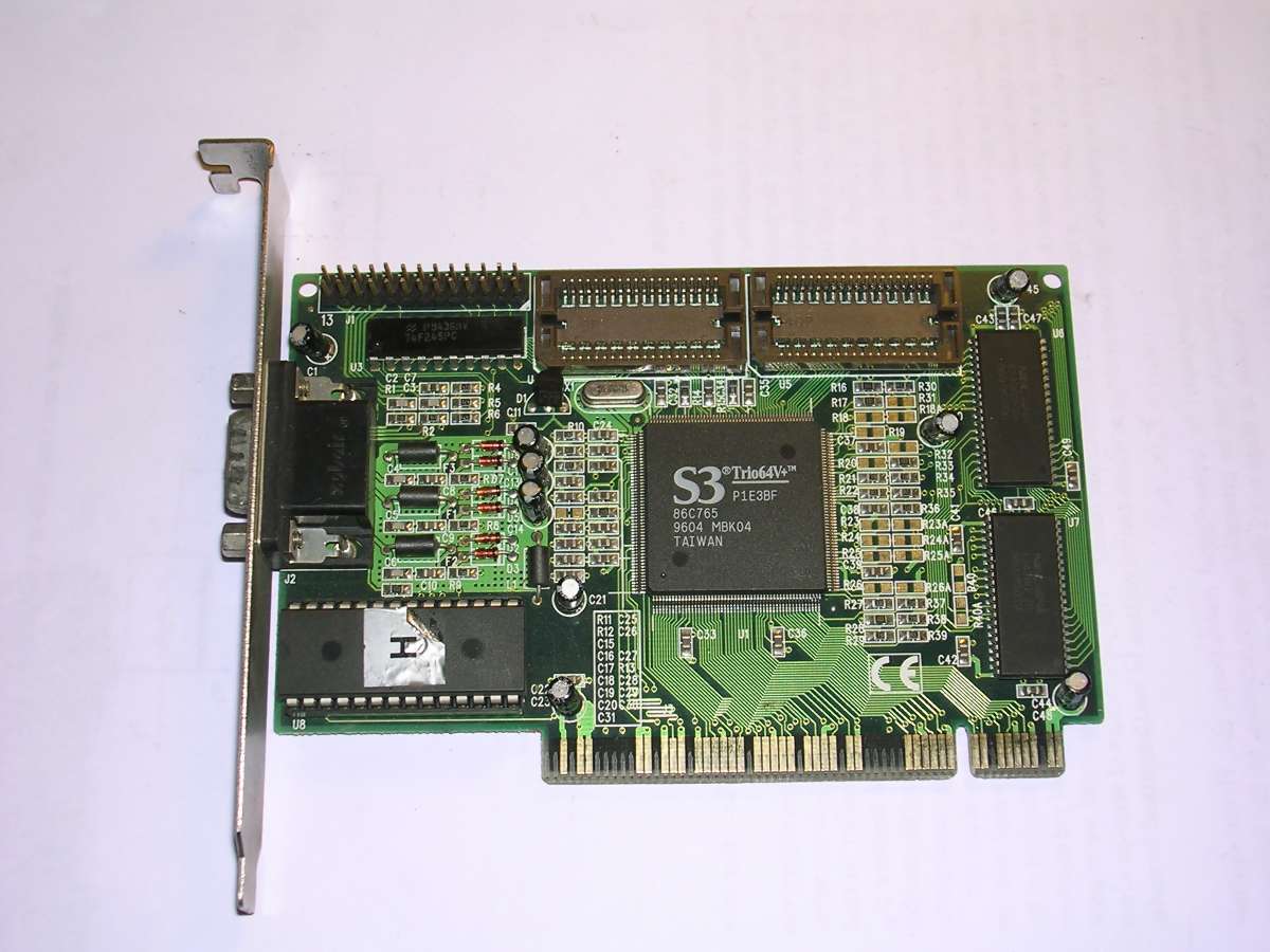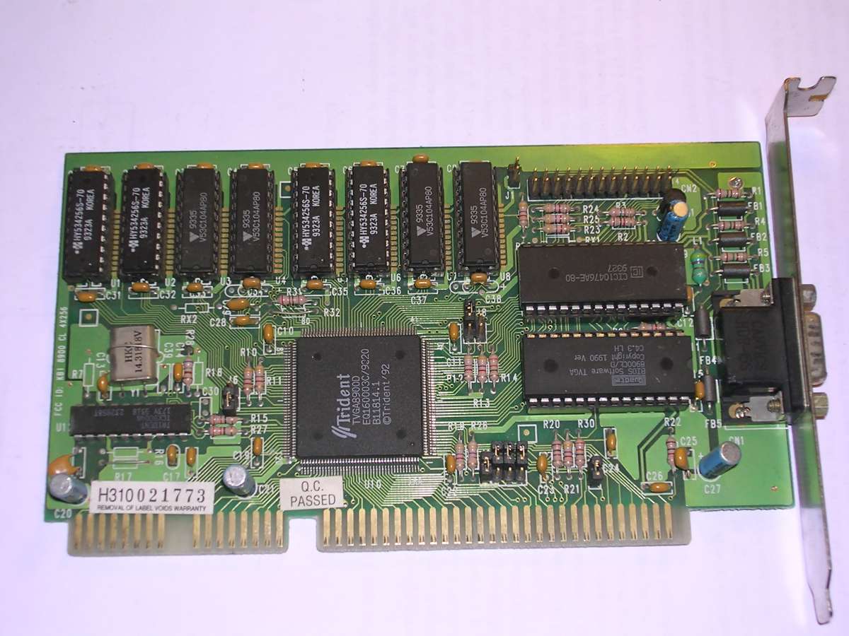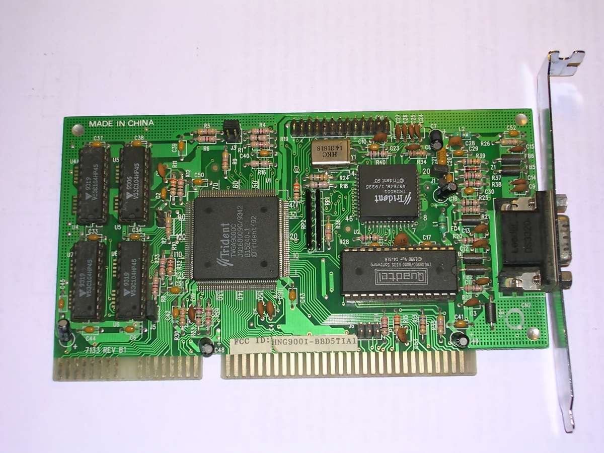 All-time popular boards, Trident TVGAs. Their popularity started around 1992 or 93, and they were used even in 96 in low-end systems. There were lots of boards containing TVGA chips, with 256, 512 or 1024kB of video RAM. Many of these boards had a segment of 3 jumpers which allowed to run them in 8-bit slot.