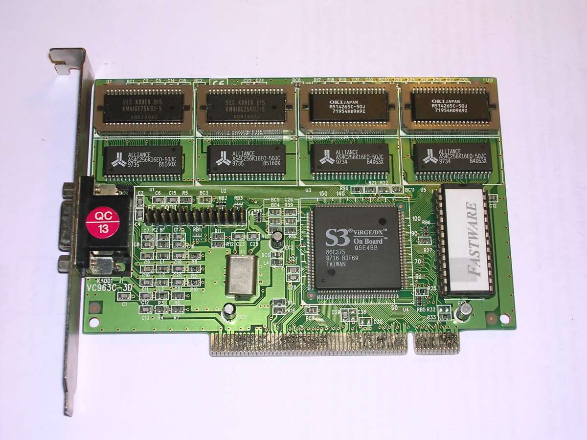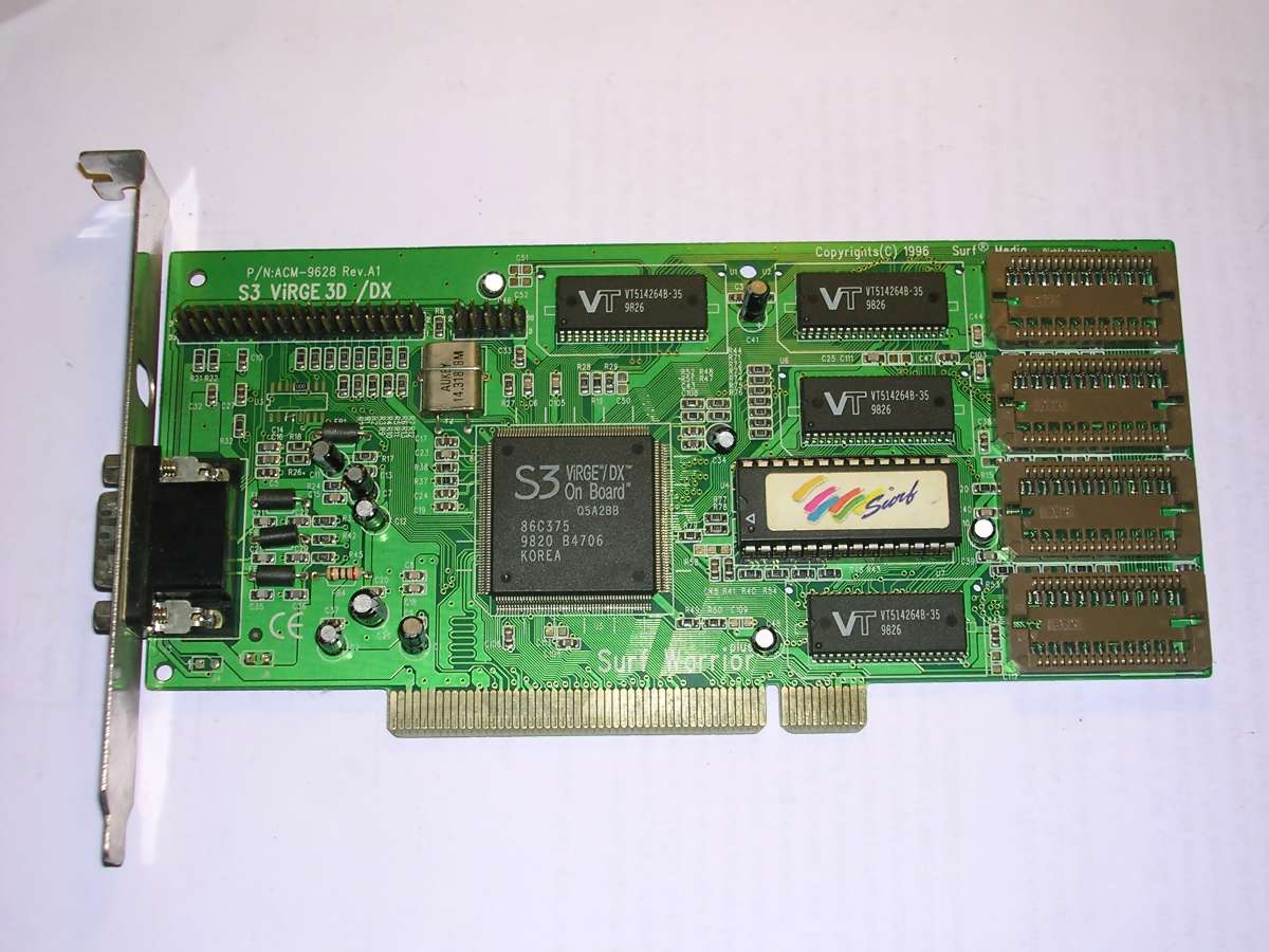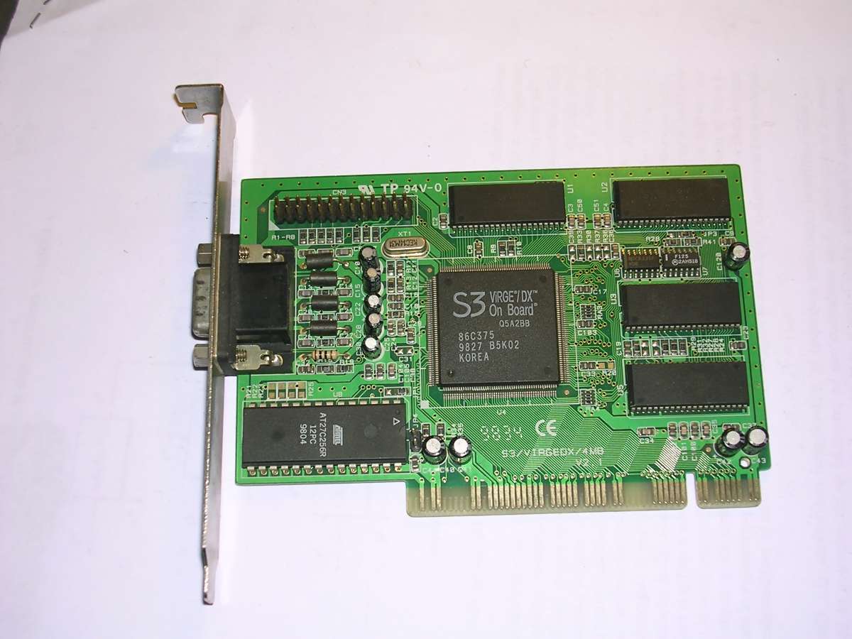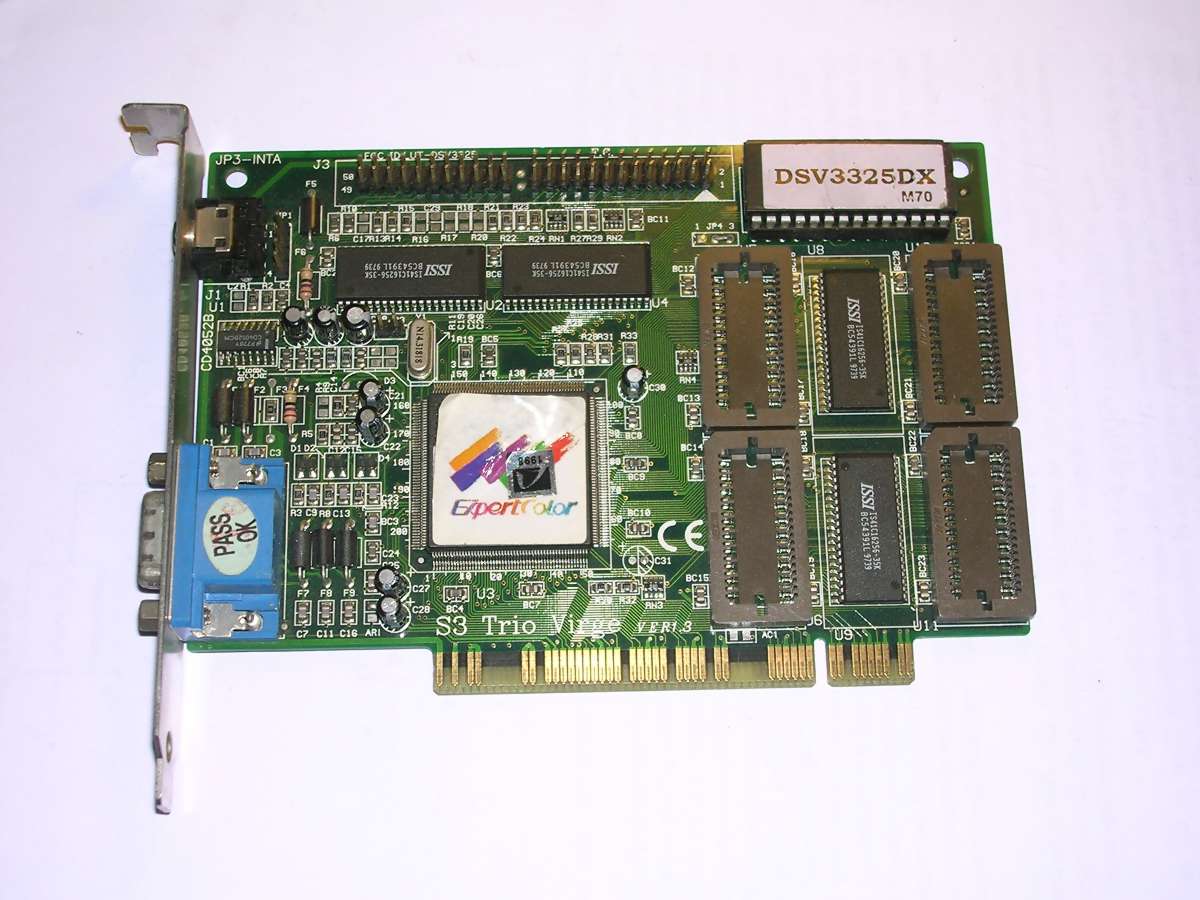 Now let's look at some PCI boards. The most popular ones were S3 Trio64 and later, a bit better ViRGE. The ViRGE had some small 3D acceleration totally sufficient for games. Most of these boards had 1 or 2MB of video memory allowing to get better resolutions and colour depths up to 24-bit. Notice the "VIRGE TRIO" board in which they had no ide what chip will be.