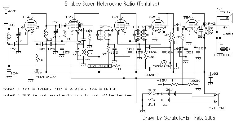 回路上で問題点が3つありました。一つ目は、1S5のフィラメント電圧の供給の仕方。二つ目は、上述したAVC/AGC回路。三つ目は電源SW。
