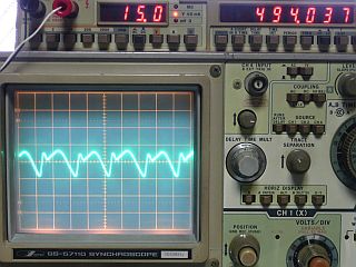 AC-100Vで動作させると、何と!出力端子に、変な信号波形?が、(利得調整など無関係に)見えるではないか!何だ?何だ?(図5)