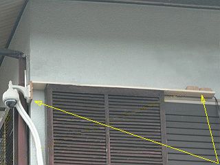 木板(120x1500x18mm)で「突き出しアーム」を作り、それに取り付けて、戸袋の上に乗せたら、雨樋などに邪魔されないで展望・監視が出来る。大変、結構!満足じゃ!(図1)