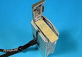 どうしても電池を入れたままにしておきたい場合には、遮蔽用の紙か何かを挟んでおく事にします。“ハイテク機器にローテク対策”と云ったところでしょうか。(左下の写真)
