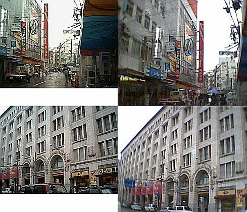 左の2連の写真は、(雨の)大阪・日本橋界隈。左がeyeplateのQVGAで、右がスティック・ショットの画像です。(どちらも、後で縮小と強調処理をしてます。)