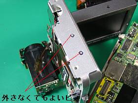 その他、DCジャックなど入出力端子ボードを留めてあるビスも外さないでいいし、三脚穴の台を留めているビスもそのままでよかったようです。