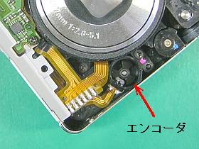 組み直す途中で、試しに電源を入れて、レンズ伸縮時に周辺を眺めていたら、3枚羽根のロータリ・エンコーダ(?)がクルクル回るのに気が付いた。(左写真)