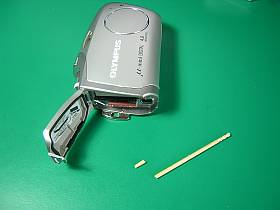 そこで、仮の処置として、爪楊枝の先を2〜3mm切り取ってそれを差し込んでおきました。これで、取り敢えず、正常動作。
