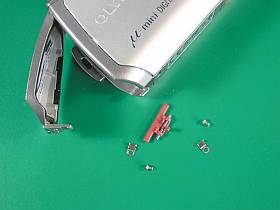 問題箇所は、左上の写真<クリック>(不良機種の分解写真)に見られるような「SW側のレバー」か、あるいはそれを押し込む「蓋側のレバー」か、そのいずれかの折れでしょう。